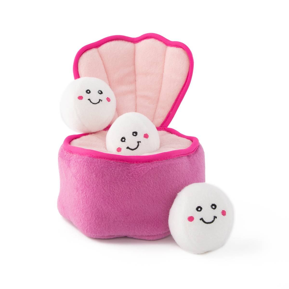 The ZippyPaws Zippy Burrow Pearls in Oyster is a hide-and-seek dog toy with a pink oyster-shaped Burrow and 3 small and squeaky pearls to hide inside. This item is from the ZippyPaws Storybook Ocean 2020 Collection.