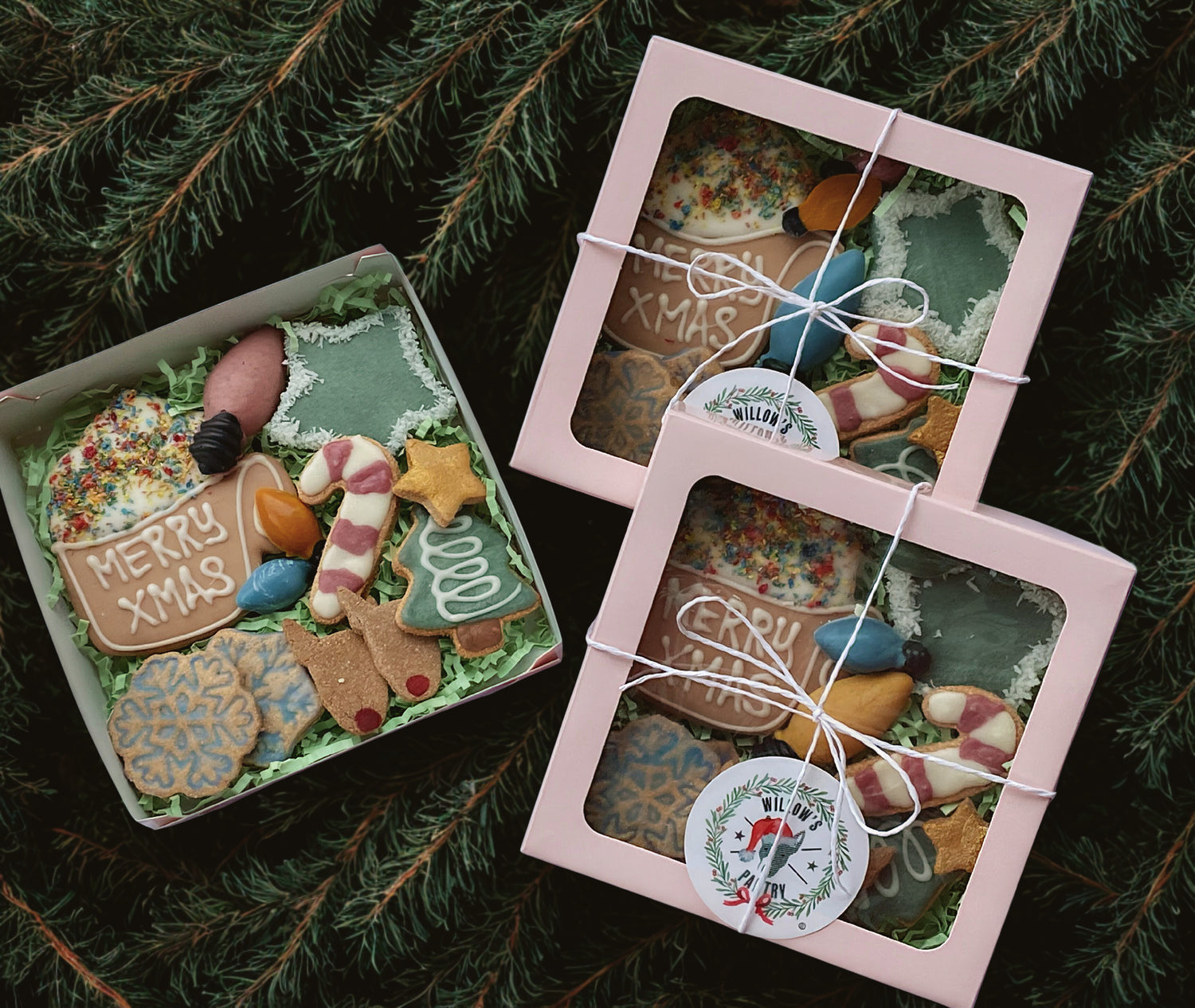 Assorted doggy shortbread with NAS yoghurt & carob buds, plant colours.