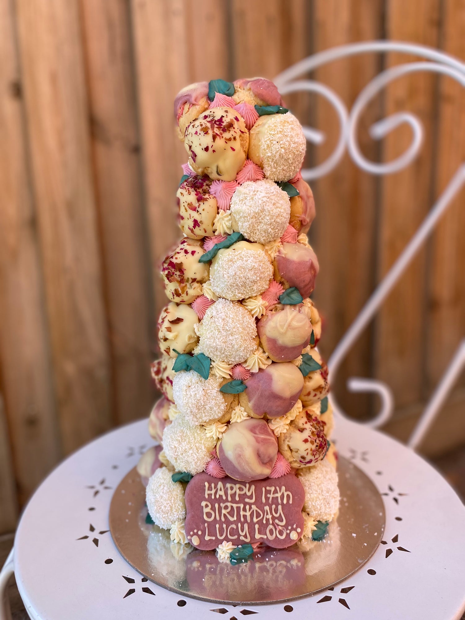 A medium Dogquembouche contains about 40-50 filled Choux and is a great cake for a slightly larger party.Â