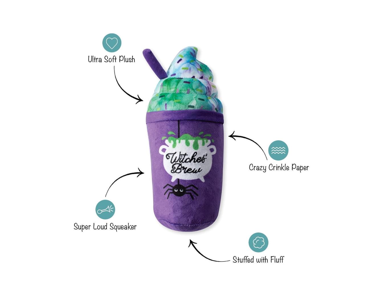 - Halloween-themed plush and squeaky dog toy featuring a Witches Brew puppicino!
