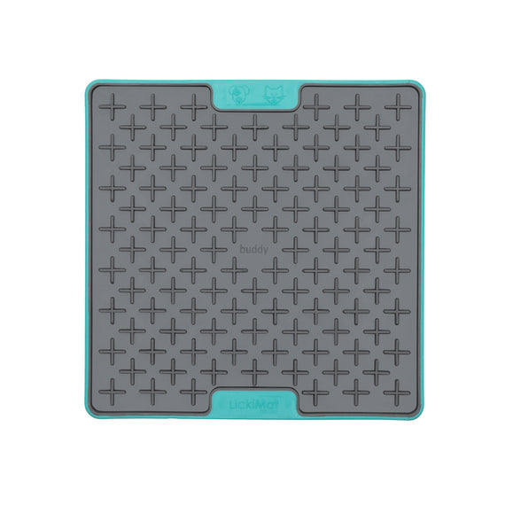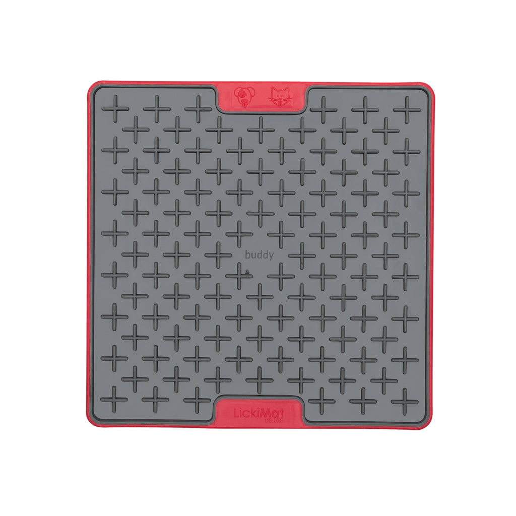 The LickiMat Tuff Buddy has a cross maze design and is perfect for use with thick, sticky treats like wet food, doggy peanut butter or soggy kibble.