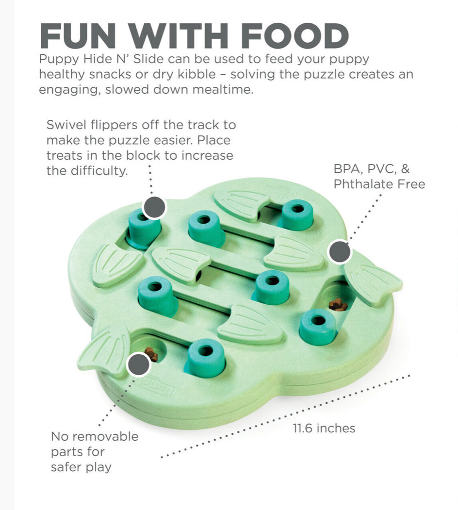 The Nina Ottosson Puppy Hide & Slide Interactive Puzzle is an intermediate-level treat-hiding puzzle game designed for puppies and features swiveling flippers and sliding blocks to customise and adjust the difficulty level. This puzzle game dog toy is food-safe and has a non-slip base.